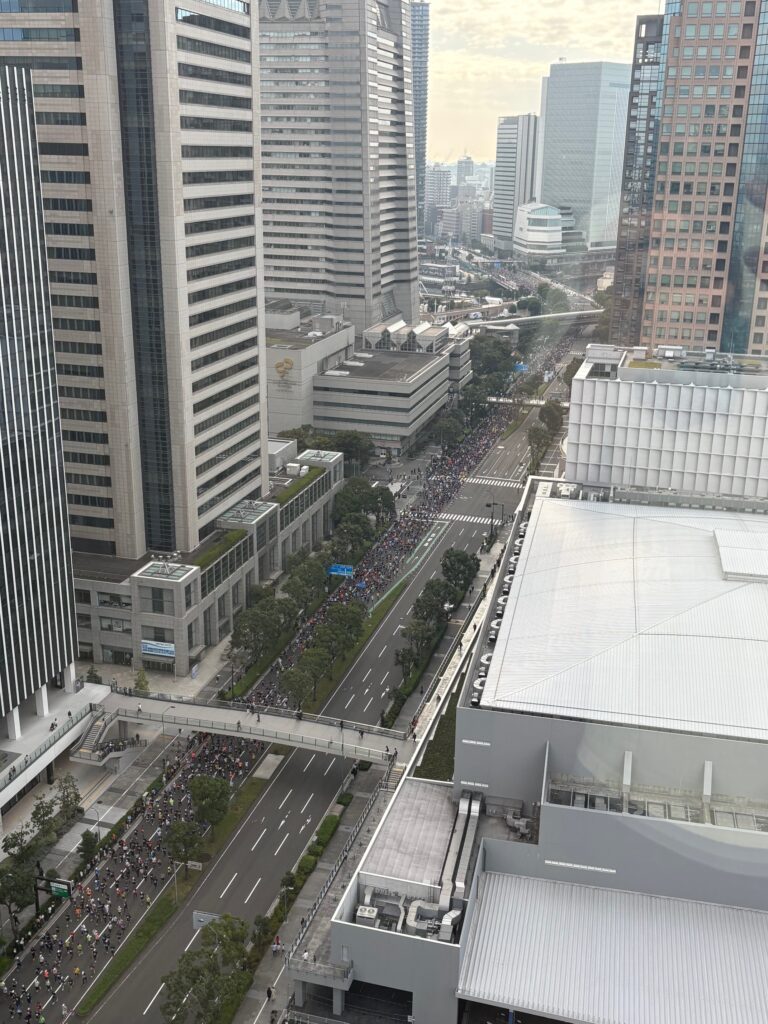 写真は日曜日朝の横浜マラソンがスタートしたところです。中央奥に見える大きな建物がランドマークタワーです。